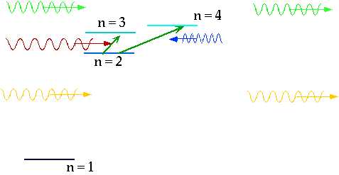 | Absorption lines occur when all wavelengths are incident on an atom, and an electron can make a jump to a higher level. Hence H gas will absorb light from a continuum spectrum | ![]() |