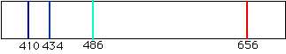 | Line at 656 nm is responsible for red colour of (e.g.) nebulae in Orion. (note the star colours in this picture are B-B colours!) | ![]() |