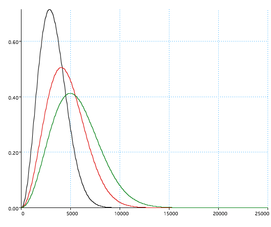 | What does this look like? The Maxwell-Boltzmann distribution is shown here for three different peak temperatures, those being 650K, 800K, and 1000K. Note that as the temperature increases, the distribution becomes more broad, and the peak of the distribution declines in magnitude. | ![]() |
