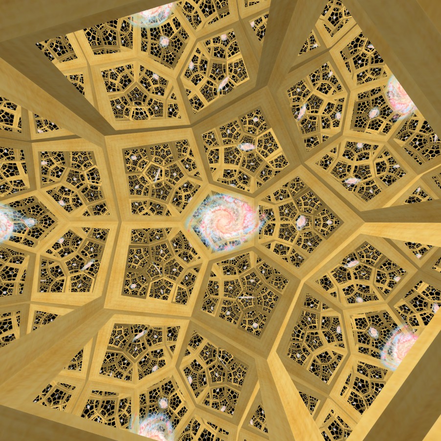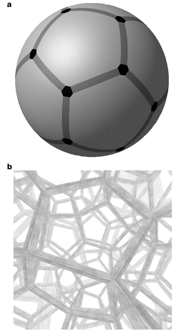 | Suggestion that this combined with Ω=1.01 is that we live in finite universe with symmetry of Poincaré dodecahedron. Can regard this either as a space filled with repeating doecahedra | Luminet et. al. Nature 425, 566-567 |