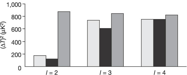| WMAP has one highly anomalous point at l=2: quadrupole, suggests points π/2 away in sky are strongly anti-correlated | ![]() |