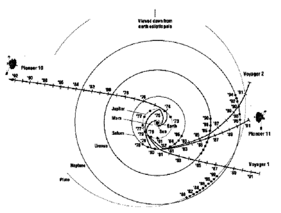 | Pioneer 10 and 11 launched 1972/73: last telemetry received from Pioneer 10, on 27 April 2002, when it was at a heliocentric distance of 80 AU. | ![]() |