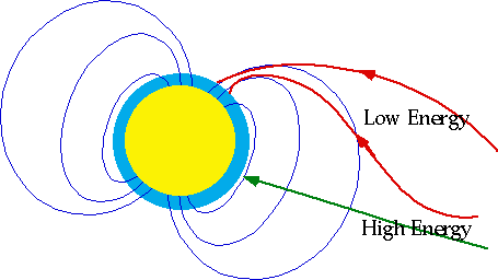 | Mag field bends charged particles: F = q v x B ⇒ radii of curvature r = mv/qB Low energy ones are bent towards magnetic poles of earth....⇒ aurora when they hit upper atmosphere |