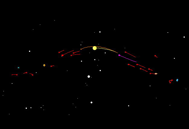 This image, drawn by the Voyager II Planetarium Software, shows the paths of the earth (green), Mars (the red square nearest the earth's orbit), Jupiter (yellow), and the twelve brightest asteroids, during the period Sept 1997 through Aug 1998.